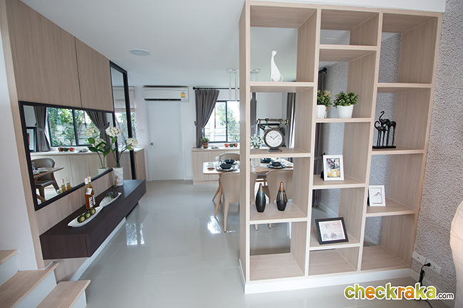เดินเข้ามาจากห้องรับแขกเข้ามา โครงการบิวท์อินชั้นวางของเป็นตัวกั้นระหว่างพื้นที่รับประทานอาหารกับห้องรับแขก