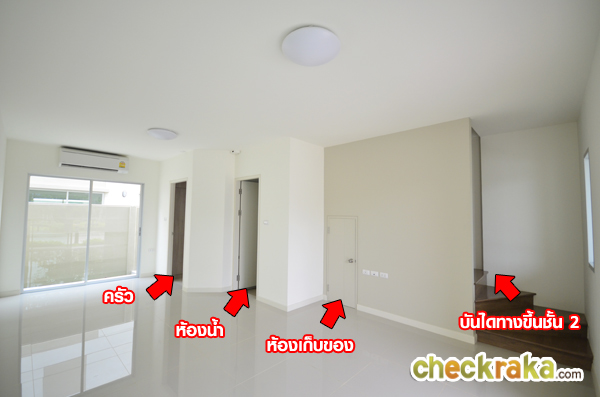 เข้ามาด้านในตัวบ้าน ส่วนแรกถูกจัดเป็นส่วนพักผ่อน รับแขก บ้านเปล่ามาตรฐาน พื้นชั้นล่างปูด้วยแกรนิตโต้ 60 x 60 ซม. บ้านที่นี่ ชั้นล่างมีความสูงจากพื้นถึงเพดาน 2.55 เมตร ไฟด้านล่างเป็นโคมไฟซาลาเปา ฝ้าที่ให้คือฝ้าเรียบค่ะ
