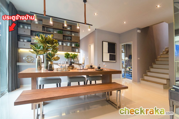 ถัดจากห้องนั่งเล่นเป็นพื้นที่โต๊ะรับประทานอาหาร ซึ่งมีประตูสามารถออกไปด้านข้างบ้านได้