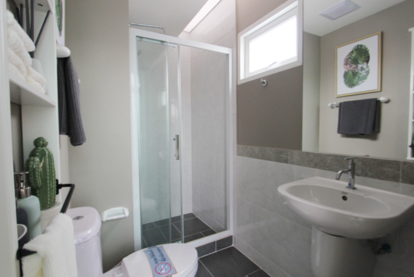 แถมฝักบัว Rain Shower และเครื่องทำน้ำอุ่น ให้ด้วย บนฝ้าเพดานยังมีช่องแสงมาให้ ช่วยให้ห้องน้ำสว่าง