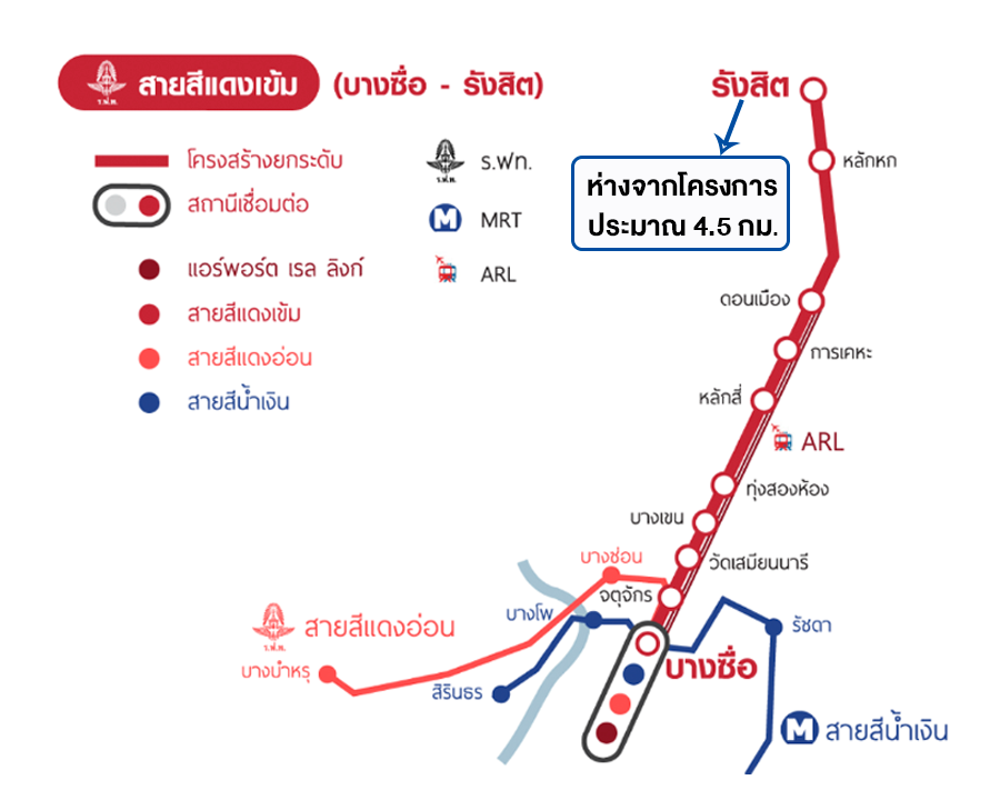 ระยะห่างจากโครงการถึงรถไฟฟ้าสีแดง สถานีรังสิต ประมาณ 4.5 กม.