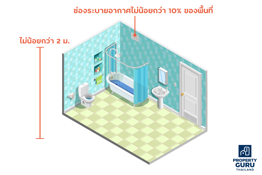 • ห้องส้วมและห้องอาบน้ำของบ้านเดี่ยว ต้องมีช่องระบายอากาศไม่น้อยกว่าร้อยละ 10 ของพื้นที่ หรือมีพัดลมระบายอากาศได้เพียงพอ ความสูงห้องน้ำระหว่างพื้นห้องถึงเพดาน หรือผนังตอนต่ำสุดต้องไม่น้อยกว่า 2 เมตร (ข้อ 61 ข้อบัญญัติ กทม)