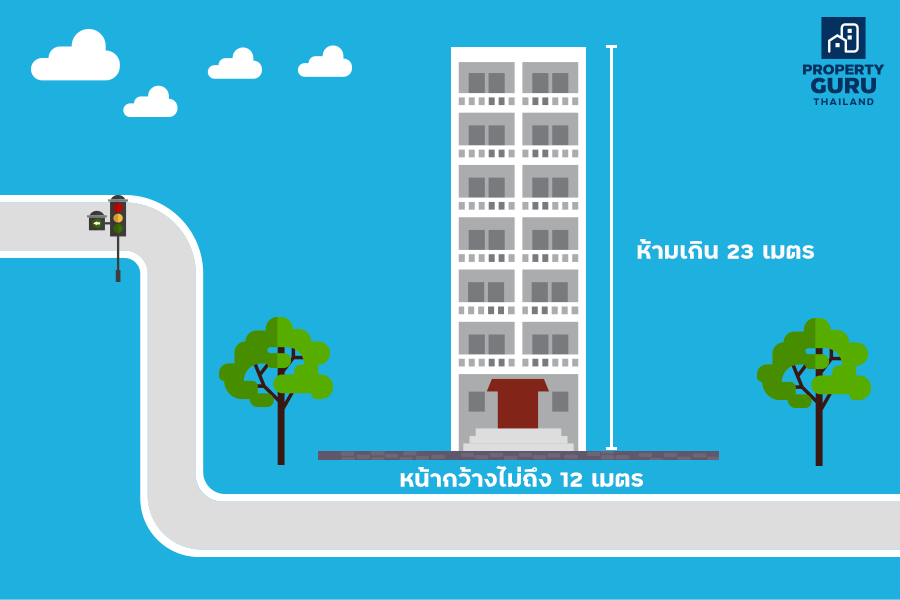 • ถ้าที่ดินหน้ากว้างไม่ถึง 12 เมตร จะสร้างบ้านสูงเกิน 23 เมตรไม่ได้