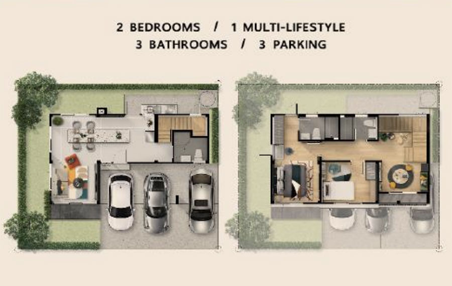 แบบ WELLNESS บ้านหน้ากว้าง 2 ชั้น พื้นที่ใช้สอย 155 ตารางเมตร ประกอบด้วย 2 ห้องนอน 3 ห้องน้ำ 1 ห้องอเนกประสงค์ ที่จอดรถ 3 คัน