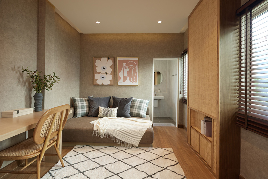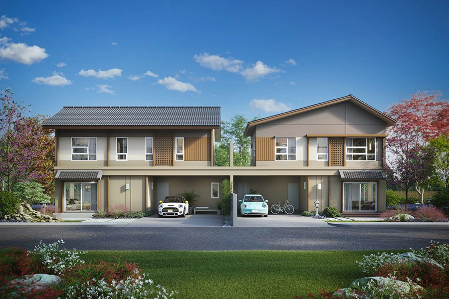 - AKI (อกิ) พื้นที่ใช้สอย 156 ตร.ม. บ้านแฝดกลาง สำหรับครอบครัวขนาดกลาง ห้องนอนพร้อมห้องน้ำส่วนตัวทุกห้อง ครัวไทยและส่วนซักล้างพร้อม Built-in ชั้นวางของ