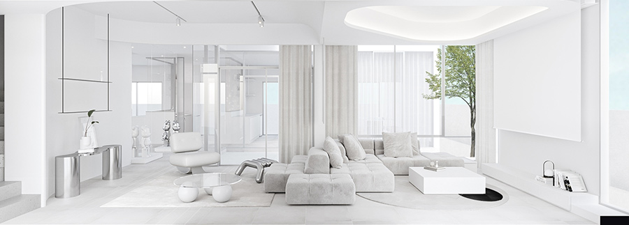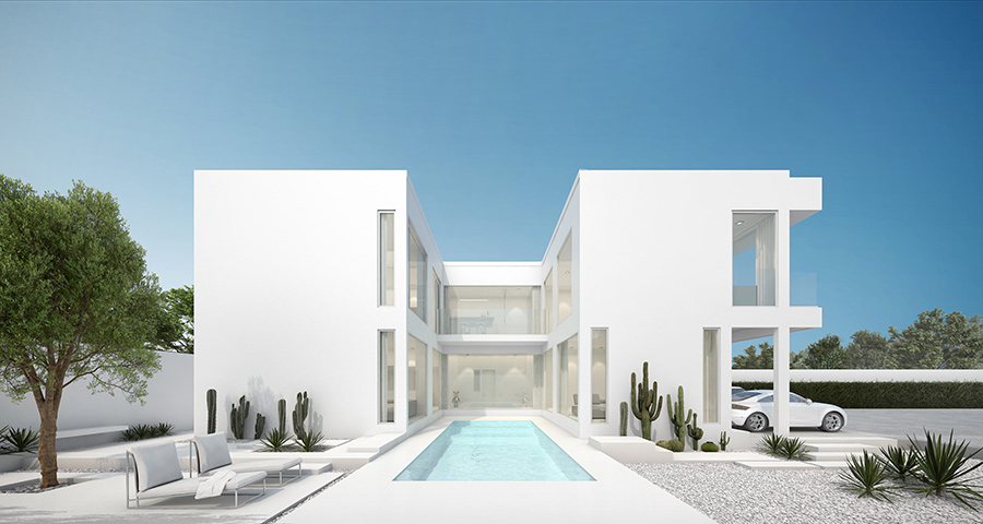 ที่สุดของบ้านมินิมอล ทางโครงการมีแบบบ้านด้วยกัน 2 แบบ- แบบแรกบ้านเดี่ยว สระว่ายน้ำส่วนตัวกลางบ้าน : พื้นที่ใช้สอยขนาด 251 ตร.ม. 2 ห้องนอนขนาดใหญ่ มาพร้อม 3 ที่จอดรถ (เพดานสูงพิเศษ Double Volume)