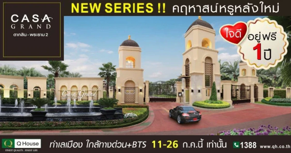 บริษัท ควอลิตี้ เฮ้าส์ จำกัด (มหาชน) จัดโปรโมชั่น "ใจดี อยู่ฟรี 1 ปี" กับโครงการ "คาซ่า แกรนด์ ตากสิน - พระราม 2 (Casa Grand Taksin - Rama 2)" บ้านเดี่ยว New Series แบบบ้านใหม่ รสนิยมเหนือระดับ คฤหาสน์หรู European Style เปิดให้ผู้สนใจเข้าจองโครงการ ในวันที่ 11-26 กรกฎาคมนี้ ณ สำนักงานขายของโครงการ