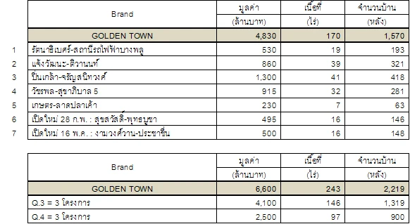 คุณภวรัญชน์ อุดมศิริ (Mr. Pawarun Udomsiri) หรือคุณจ๊อบ ผู้ช่วยกรรมการผู้จัดการอาวุโส โกลเด้นแลนด์ เรสซิเด้นซ์ กรุ๊ป ในเครือ บริษัท แผ่นดินทอง พร็อพเพอร์ตี้ ดีเวลลอปเม้นท์ จำกัด (มหาชน) หรือ GOLD เปิดเผยว่า "โกลเด้น ทาวน์ (GOLDEN TOWN) เป็นแบรนด์ที่ทางบริษัทใช้กับโครงการทาวน์โฮม ซึ่งแม้ว่าจะเพิ่งเปิดตัวครั้งแรกในปีที่แล้ว แต่นับได้ว่ากระแสตอบรับดีเกินคาด ทำให้บริษัทเตรียมการเปิดทำเลใหม่ๆ เพื่อตอบรับความต้องการของลูกค้ามาอย่างต่อเนื่อง โดยในปีที่ผ่านมามีทั้งสิ้น 5 ทำเล คือ รัตนาธิเบศร์, แจ้งวัฒนะ, ปิ่นเกล้า, วัชรพล และเกษตร-ลาดปลาเค้า และในปีนี้เปิดใหม่อีก 2 โครงการ โดยในไตรมาสแรก เปิดโครงการสุขสวัสดิ์ มียอดจองถึง 80% หรือ 400 ล้านบาท และไตรมาสที่ 2 เปิดโครงการงามวงศ์วาน ซึ่งสามารถปิดการขายได้ในวันเปิดจองทั้ง 100% ซึ่งถือเป็นปรากฏการณ์ใหม่ของวงการทาวน์โฮม ปัจจุบันบริษัทมีโครงการโกลเด้น ทาวน์ ทั้งสิ้น 7 ทำเล มูลค่ารวม 4,830 ล้านบาท และมีแผนงานเตรียมเปิดโครงการใหม่อีก 6 ทำเลในครึ่งปีหลังนี้ มูลค่า 6,600 ล้านบาท รวมมูลค่าโครงการเฉพาะแบรนด์ โกลเด้น ทาวน์ ทั้งหมดจะสูงถึง 11,430 ล้านบาท"