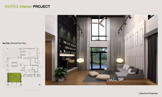 บรรยากาศบริเวณห้องนั่งเล่น เพดานสูง ให้ความรู้สึกที่โปร่ง สบาย