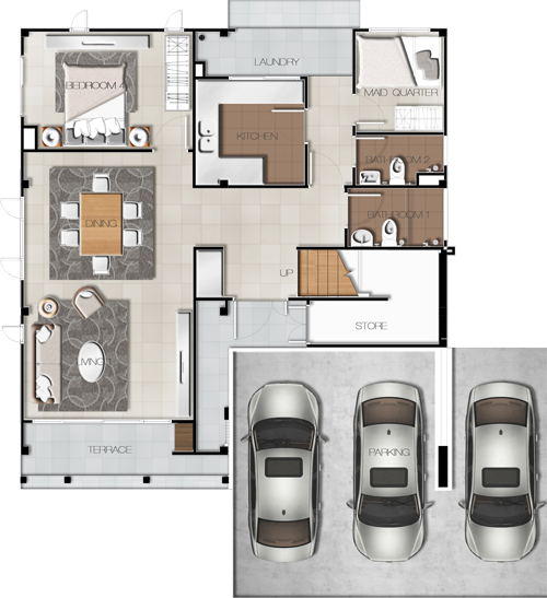 1. แบบบ้าน MAISON - บ้านเดี่ยว 2 ชั้น พื้นที่ใช้สอย 219 ตร.ม. บนพื้นที่ 50 ตร.วา ขนาด 3 ห้องนอน 3 ห้องน้ำ 2-3 ที่จอดรถ ส่วนพักผ่อน ห้องครัวและพื้นที่ซักรีด พร้อมด้วย Study Room ที่สามารถปรับเปลี่ยนฟังก์ชันตามการใช้งานอื่น ครัวและลานซักล้างขนาดใหญ่ที่ถูกออกแบบและก่อสร้างโดยคำนึงถึงการใช้ชีวิตจริง