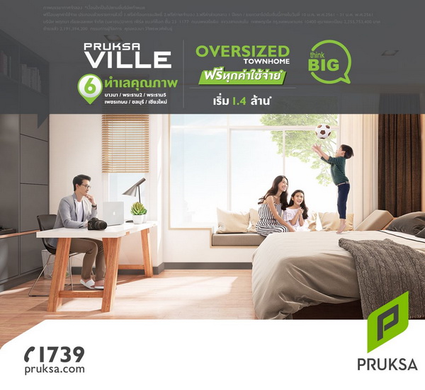 โปรโมชั่น: Pruksa Ville Oversized Townhome ฟรีทุกค่าใช้จ่าย* 6 ทำเลคุณภาพ บางนา, พระราม 2, พระราม 5, เพชรเกษม, ชลบุรี, เชียงใหม่ เริ่ม 1.4 ล้านบาท*