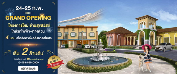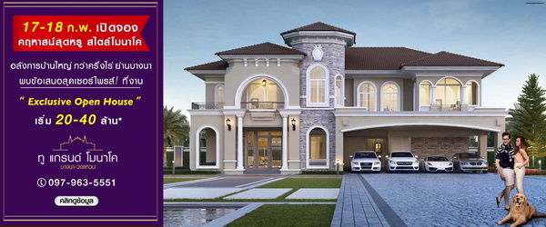 ทู แกรนด์ โมนาโค บางนา-วงแหวน 17-18 ก.พ. ต้องรีบมา!! พบข้อเสนอสุดเซอร์ไพรส์! ที่งาน "Exclusive Open House" เปิดจองคฤหาสน์สุดหรู สไตล์โมนาโค ย่านบางนา ติดถนนใหญ่ ใกล้สุวรรณภูมิ+เมกะบางนาเปิดอาณาจักรบ้านใหญ่ 5 ห้องนอน กว่าครึ่งไร่ อลังการสโมสร+สวนธรรมชาติรอบโครงการ เริ่ม 20-40 ล้านบาท*