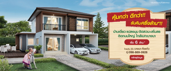 โกลเด้น นีโอ บางนา-กิ่งแก้ว คุ้มกว่า? ดีกว่า! มีที่นี้ที่เดียว!!! จองทันที รับคืน ครึ่งล้าน*! บ้านเดี่ยวพร้อมอยู่ 4 ห้องนอน ทำเลดีที่สุด แปลงมุม ติดสวน+สโมสร บนทำเลศักยภาพ ติดถนนใหญ่ ใกล้เมกะ+สุวรรณภูมิ เริ่มต้นเพียง 6 ล้าน*