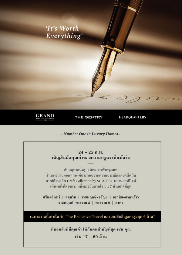 www.apthai.com โปรโมชั่น: 24 - 25 กุมภาพันธ์ 2561 เชิญสัมผัสคุณค่าของความหรูหราที่แท้จริง กับคฤหาสน์หรู 8 โครงการทั่วกรุงเทพ ผ่านการถ่ายทอดทุกองค์ประกอบจากความประณีตและพิถีพิถัน ภายใต้แนวคิด Craft Collection by SC ASSET ผสานการดีไซน์เพียงหนึ่งโครงการ หนึ่งแรงบันดาลใจ บน 7 ทำเลที่ดีทีสุด เฉพาะงานนี้เท่านั้น รับ The Exclusive Travel และเอกสิทธิ์ มูลค่าสูงสุด 6 ล้านบาท*