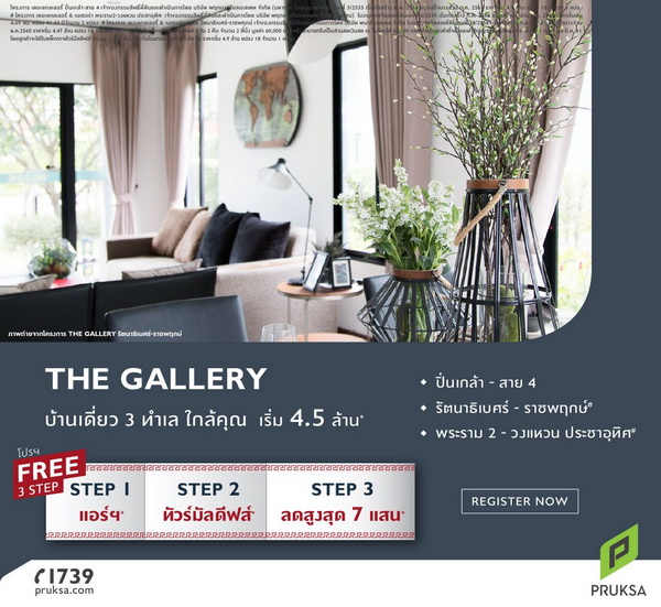 โปรโมชั่น: The Gallery บ้านเดี่ยว 3 ทำเล ใกล้คุณ เริ่ม 4.5 ล้านบาท* รับฟรี 3 Step Step 1 แอร์* / Step 2 ทัวร์มัลดีฟส์* / Step 3 ลดสูงสุด 7 แสน*