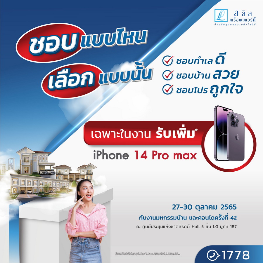 พิเศษ! เฉพาะผู้ที่จองภายในงาน รับฟรี I Phone 14 Pro max พร้อมรับเฟอร์นิเจอร์ หรือส่วนลดสูงสุดมูลค่า 500,000 บาท* (เงื่อนไขเป็นไปตามที่บริษัทกำหนด) ได้รับเมื่อจองภายในวันที่ 27-30 ตุลาคม 2565 และโอนกรรมสิทธิ์ภายในวันที่ 30 พฤศจิกายน 2565 สามารถลงทะเบียนรับสิทธิ์ได้ที่