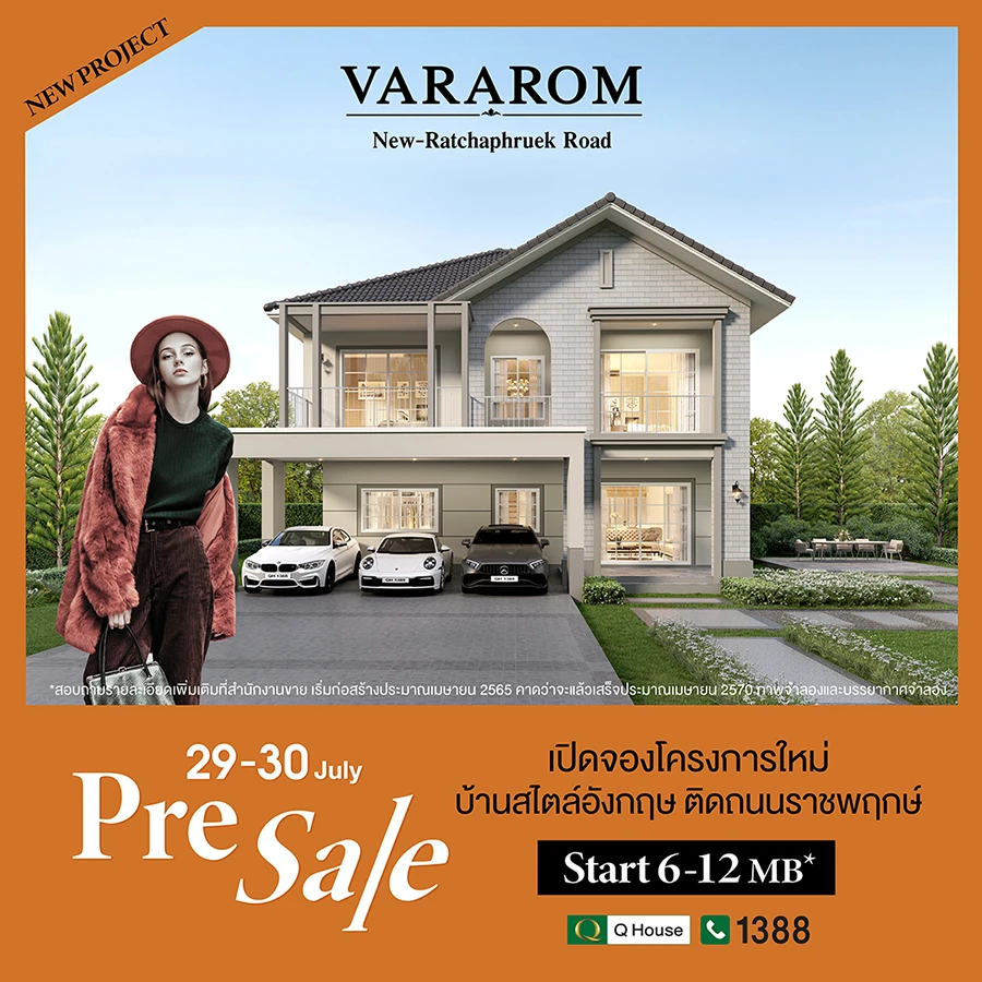 เชิญสัมผัสมนต์เสน่ห์สไตล์อังกฤษ ที่โครงการ โครงการ “วรารมย์ ราชพฤกษ์ตัดใหม่” มอบสิทธิพิเศษสำหรับลูกค้าที่จองบ้านภายในวันงาน Pre-Sale 29 ก.ค. 2566 - 30 ก.ค. 2566 รับส่วนลด 100,000 บาท* ทุกหลัง ท่านผู้สนใจสอบถามรายละเอียดเพิ่มเติมที่สำนักงานขายโครงการฯ โทร.1388 หรือ ID Line: @q-house เว็บไซต์