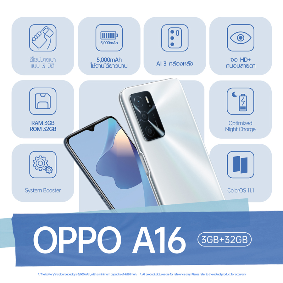โดย OPPO A16 รุ่น RAM 3GB + ROM 32GB ให้คุณใช้งานได้ยาวนานตลอดวันด้วยแบตเตอรี่ขนาดใหญ่ 5,000mAh มาพร้อมฟีเจอร์ Optimized Night Charge ช่วยควบคุมอุณหภูมิเครื่องเมื่อชาร์จแบตเตอรี่ในเวลากลางคืน พร้อม System Booster เพิ่มประสิทธิภาพให้คุณสามารถใช้งานได้รวดเร็วยิ่งขึ้น และให้คุณถ่ายภาพได้โดดเด่น ด้วย AI 3 กล้องหลัง และกล้องหน้า 8MP มอบเซลฟี่สวยโดนใจ พร้อมโดดเด่นด้วยหน้าจอ HD+ พร้อม Eye-care Display หน้าจอถนอมสายตาที่อัดแน่นด้วยฟีเจอร์ AI Smart Backlighting, Sunlight Screen และ Moonlight Screen ให้คุณใช้งานได้สบายตาในทุกสภาพแสง โดดเด่นด้วยดีไซน์บางเบา 3 มิติ ทนทานด้วยระดับการกันน้ำระดับ IPX4