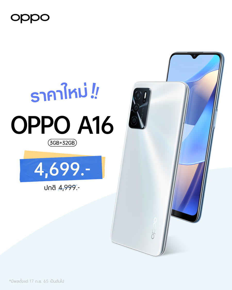 OPPO A16 รุ่น RAM 3GB + ROM 32GB สมาร์ตโฟนสุดคุ้ม พร้อมมอบความบันเทิงเต็มอิ่มยาวนานตลอดวันได้ง่ายยิ่งขึ้น มาพร้อมราคาใหม่เพียง 4,699 บาท จากราคาปกติ 4,999 บาท ตั้งแต่วันที่ 17 กันยายน 2565 เป็นต้นไป