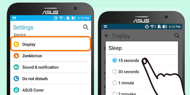 ตั้งให้โทรศัพท์มือถือของคุณอยู่ในโหมด sleep เร็วขึ้น ในเวลาที่คุณไม่ได้ใช้งานต่อเนื่อง วิธีทำให้เข้าไปที่ Settings (การตั้งค่า) แล้วเข้า Display (การแสดงผล) เลือก Sleep (สลีป) อาจจะเปลี่ยนการตั้งเวลาจากเดิม 1 นาที เป็น 15 วินาที เป็นต้น หรือหากจะเปลี่ยนหน้า cover ให้ standby สั้นลง ก็สามารถเปลี่ยนได้โดยเข้า Settings (การตั้งค่า) แล้วเข้า ASUS Customised Setting (การตั้งค่าแบบกำหนดเองของ ASUS) เลือก ASUS Cover settings (การตั้งค่า ASUS Cover) แล้วเลือก Automatic sleep (สลีปอัตโนมัติ)
