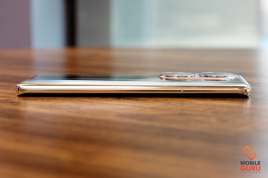 สำหรับเครื่องที่นำมารีวิวจะเป็นสีทอง Cocoa Gold ซึ่งจะเป็นสีทองจางๆครับ ดูจะออกเงินๆอมทองนวลๆมากกว่า ซึ่งผมว่าเป็นโทนสีที่สวยงามและดูหรูหรามากๆเลย ฝาหลังเป็นกระจกเงาวับ ถ้าไม่ใส่เคสผมว่าเช็ดกันทั้งวันเลยครับ (แต่สวยนะ) พร้อมการวางโลโก้ HUAWEI และ LEICA ได้อย่างเรียบหรู ชุดกล้องหลัง Dual-Matrix Camera Design ดูพิเศษและสะดุดตามากๆ ประกอบด้วยกล้องหลัง 4 เลนส์ Leica ความละเอียด 50MP F1.8, 23 มม. (wide), PDAF, Laser AF, OIS + 64MP F3.5, 90 มม. (periscope telephoto), PDAF, OIS, 3.5x optical zoom, 100x digital zoom + 13MP F2.2, 120 องศา, 13 มม. (ultrawide) + 40MP F1.6, 23 มม. (B/W) พร้อม dual-LED flash ที่วางตำแหน่งห่างกัน และมีไมค์อีก 1 ตัวอยู่บริเวณกล้องด้วย เรียกได้ว่าจัดเต็มเพื่อการถ่ายภาพเลยครับ และกล้องหลังบันทึกวิดีโอระดับ 4K 30/60fps, 1080p 30/60fps, 1080p 960fps, gyro-EIS