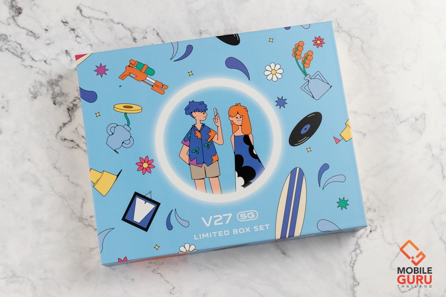 vivo V27 5G Limited Box Set มูลค่า 10,798 บาท ผลงานภาพประกอบโดย Bloody Hell Big Head ศิลปินสาย illustrator ชื่อดัง ออกแบบรับกับเทศกาลสงกรานต์พอดีเลยครับ น่ารักมากๆ โดยหน้ากล่องจะมาพร้อมจุดขายของรุ่นนี้อย่างแฟลชวงแหวน Aura Light โดยภายในกล่องจะประกอบด้วย