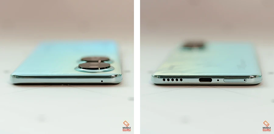 ด้านล่าง มีลำโพง, พอร์ต USB-C, ช่องใส่ซิมการ์ด SIM รองรับ 2 Nano SIMs, ไมโครโฟน