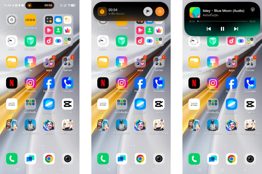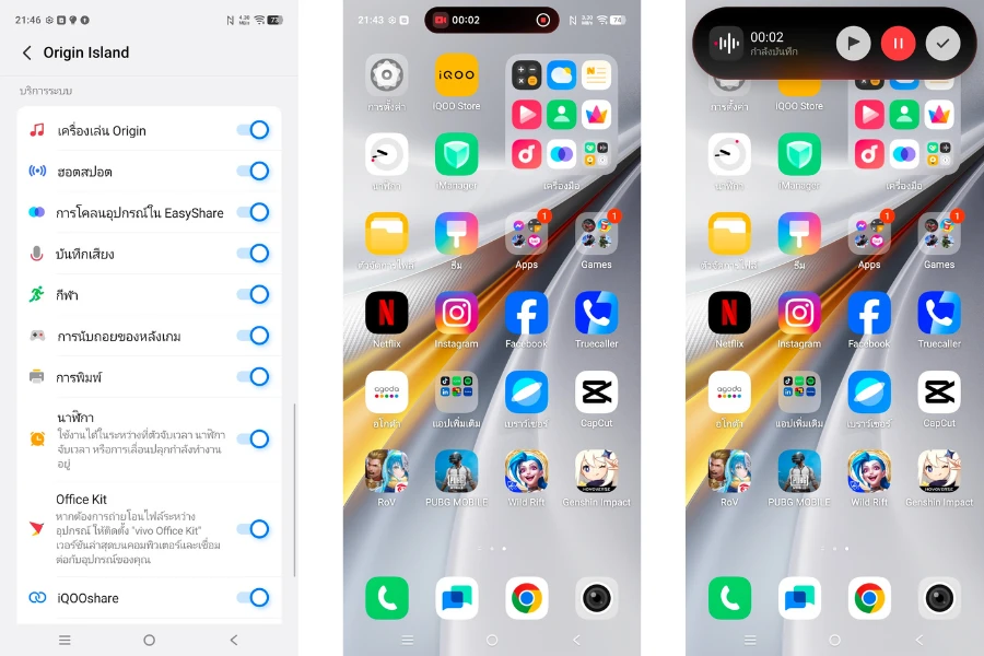มีฟีเจอร์ Origin Island จาก OriginOS 6 จะเป็นแถบแจ้งเตือเตือนกิจกรรมต่างๆ ที่เราได้เปิดช้งานอยู่ในขณะนั้น เช่น การเล่นเพลง, บันทึกเสียง, จับเวลา และอื่นๆ สามารถเห็นหรือเปิด/ปิดได้จากแถบ Origin Island ได้อย่างง่ายๆ