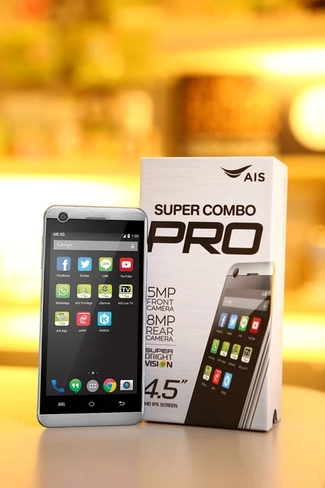 เอไอเอส ตอกย้ำความแรงของแคมเปญสุดฮิต "AIS Super Combo" เปิดตัวสมาร์ทโฟนคุณภาพรุ่น Pro 4.5" ในระบบปฏิบัติการ Android 4.4 KitKat สุดล้ำ เอาใจคอเซลฟี่ด้วยกล้องหน้า 5 ล้านพิกเซลและกล้องหลัง 8 ล้านพิกเซล แรงสุดกับขุมพลัง Quad-core 1.3 GHz ใช้งานง่ายด้วยระบบสั่งงานแบบสัมผัสในขณะปิดหน้าจอ เต็มอิ่มทุกความบันเทิงด้วยหน้าจอคมชัด Super Bright Vision ขนาด 4.5 นิ้ว