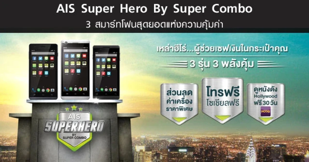 เอไอเอสจัดเต็มเพื่อผู้บริโภคอีกครั้งกับโปรโมชั่น "AIS Super Hero By Super Combo" ที่สุดของสมาร์ทโฟน 3 รุ่นจากเอไอเอส ผสานพลังถึง 3 คุ้ม ช่วยเซฟเงินให้คุณ โดยมีให้คุณเลือกถึง 3 แบบตามความต้องการ ดังนี้