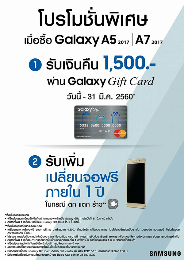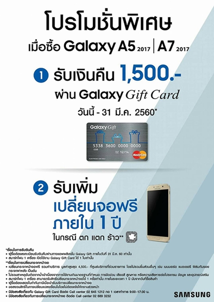 เพียงซื้อ Galaxy A รุ่นปี 2017 วันนี้! รับเงินคืน 1,500 บาท ผ่าน Galaxy Gift Card ซึ่งแถมมาในกล่องให้เลย หลังจากลงทะเบียนในแอปพลิเคชัน Galaxy Gift จะได้เงินคืนเข้าบัตรโดยอัตโนมัติ (ภายในวันที่ 31 มีนาคมเท่านั้น) และสามารถนำไปใช้ซื้อของได้เลยทันที ซึ่งบัตร Galaxy Gift Card Mastercard สามารถใช้งานได้แบบเดียวกับบัตรเครดิต Mastercard ทั่วไปสามารถรับสิทธิพิเศษ หรือโปรโมชันที่ร่วมรายการกับ Mastercard ได้ทันที และยังสามารถเพิ่มเข้า Samsung Pay เพื่อใช้จ่ายผ่านระบบ Samsung Pay ได้ด้วย นอกจากนี้ผู้ซื้อ Samsung Galaxy รุ่นปี 2017 ยังได้รับสิทธิ์การเปลี่ยนหน้าจอฟรีภายใน 1 ปี อีกด้วย