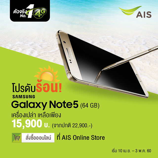 เอไอเอส จัดเต็มกับโปรโมชั่นดับร้อน Samsung Galaxy Note5 64GB และ Samsung Galaxy A3 (2017) ลดราคาสูงสุด 7,000 บาท สำหรับลูกค้า AIS รายเดือน ไม่ต้องจ่ายล่วงหน้า ไม่ต้องเปลี่ยนแพ็กเกจ ใครสนใจอยู่รีบหน่อย ถึงวันที่ 3 พฤษภาคม 2560 นี้เท่านั้น สินค้ามีจำนวนจำกัดนะครับ หมดแล้วหมดเลย (หากสั่งซื้อระหว่าง 12 - 17 เมษายน นี้ ของจะเริ่มจัดส่งตั้งแต่ 17 เมษายน 60 เป็นต้นไป)