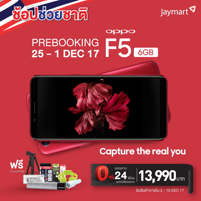 OPPO F5 RAM 6GB จะแตกต่างจาก OPPO F5 รุ่นเดิมในส่วนของ RAM 6GB (จากเดิม 4GB) และ ROM 64GB (จากเดิม 32GB) และมีสีแดงที่เพื่อนๆ ชื่นชอบมาเป็นตัวเลือกด้วยครับ โดยรุ่นนี้จะมีให้เลือก 2 สี ได้แก่ สีแดง และสีดำ มีราคาวางจำหน่ายอยู่ที่ 13,990 บาท ใครที่สนใจสมารถสั่งจองได้ตั้งแต่ 25 พ.ย. - 1 ธ.ค. และจะวางจำหน่ายอย่างเป็นทางการวันที่ 2 ธ.ค.นี้ โดยทาง Jaymart มีโปรโมชั่นผ่อน 0% นานสูงสุด 24 เดือน พร้อมรับฟรี ! Jaymart Premium Set (นอกเหนือจากของแถมมาตรฐานของ OPPO)