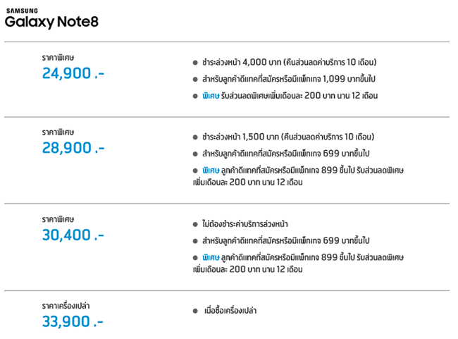 Samsung Galaxy S8+ (ราคาเครื่องเปล่า 30,900 บ.) ลดสูงสุด 12,900 บาท เมื่อสมัครแพ็กเกจเริ่มต้น 599 ขึ้นไป สามารถรับเงินคืนเพิ่มอีก 3,000 บาท ผ่าน Samsung Pay ผ่อนได้ทั้งค่าเครื่องและค่าบริการรายเดือนล่วงหน้า 0% นานสุงสุด 24 เดือน (ส่วนลดนี้รวมส่วนลดค่าบริการรายเดือน 2,400 บาท) ลูกค้าย้ายค่ายเบอร์เดิมรับส่วนลดเพิ่มอีก 1,500 บาท