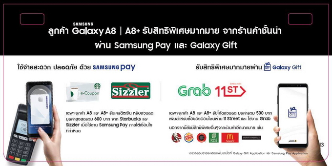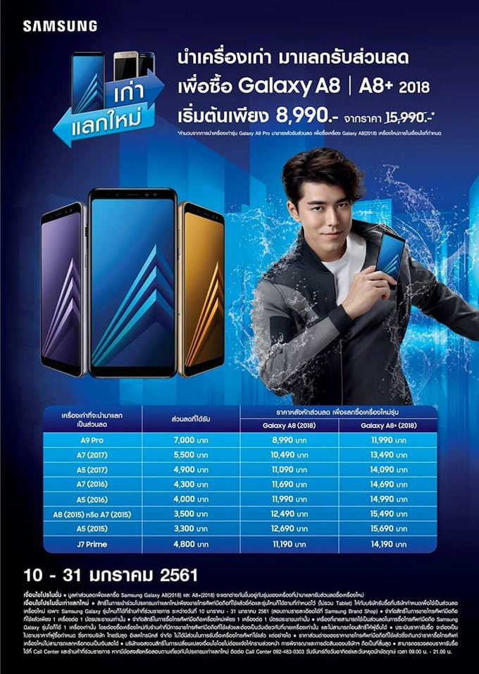 นอกจากนี้ ยังมาพร้อมโปรโมชั่นพิเศษ "นำเครื่องเก่า มาแลกรับส่วนลด เพื่อซื้อ Samsung Galaxy A8 (2018) หรือ Samsung Galaxy A8+ (2018)" ในราคาเริ่มต้นเพียง 8,990 บาท (ตามเงื่อนไขที่กำหนด) ตั้งแต่วันที่ 12 - 31 ม.ค. 2561