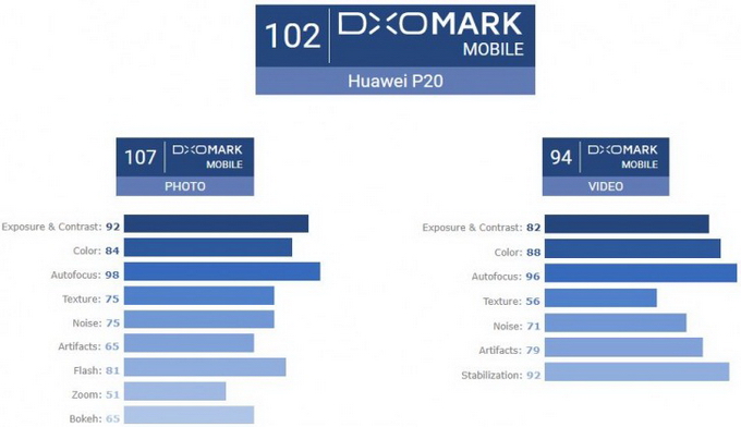 - Huawei P20 ได้ 107 คะแนนสำหรับภาพนิ่ง และ 94 คะแนนสำหรับวีดีโอ รวม 102 คะแนน