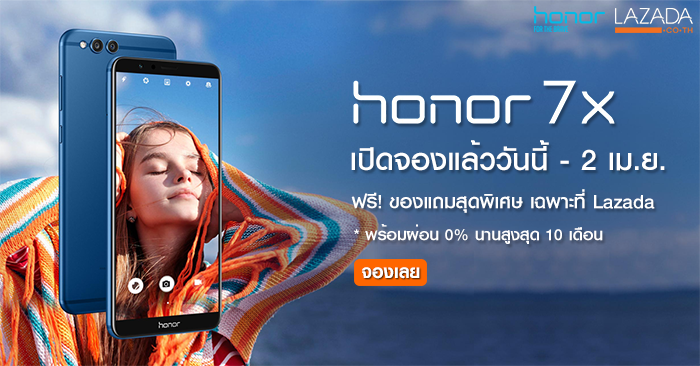 จอง Honor 7X กับ ลาซาด้า ฟรี! ของแถมสุดพิเศษ พร้อมผ่อน 0% นาน 10 เดือน วันนี้ - 2 เม.ย. 2561