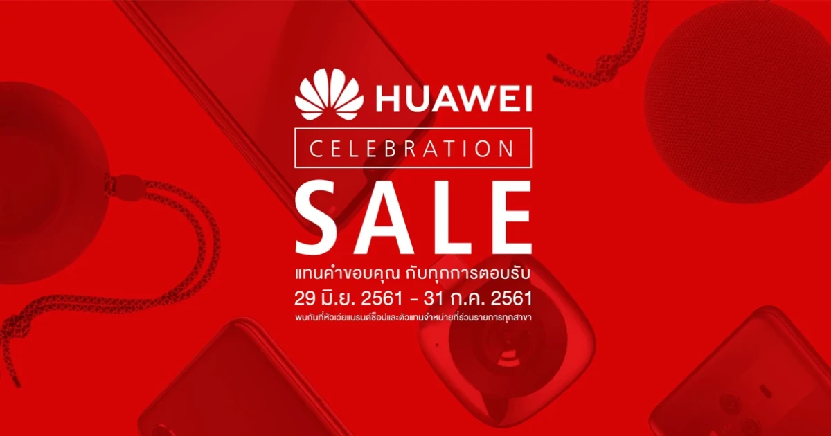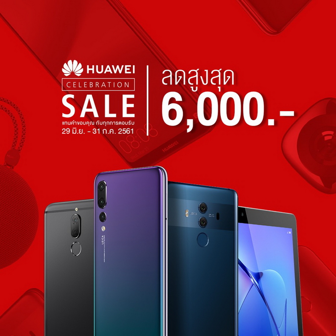 หัวเว่ย แทนคำขอบคุณให้ลูกค้าด้วยการมอบแคมเปญพิเศษ HUAWEI Celebration Sale ฉลองกลางปี ขนทัพสมาร์ทโฟนและแท็บเล็ตสุดฮิตให้ลูกค้าเป็นเจ้าของในราคาพิเศษ ได้แก่ HUAWE P20 Series, HUAWEI Mate 10 Pro, HUAWEI nova2i, HUAWEI Y9 2018 และ HUAWEI MediaPad T3 10 ตั้งแต่วันนี้ - 31 กรกฎาคม 2561