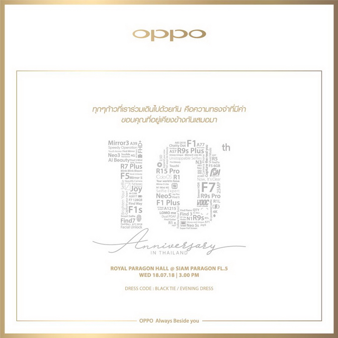 ข่าวความเคลื่อนไหวล่าสุดสำหรับในบ้านเรา ออปโป้ ประเทศไทย เตรียมจัดงานครบรอบ 10 ปี ของบริษัท ในชื่อว่า "OPPO 10 Years Anniversary" ในวันที่ 18 ก.ค. นี้พร้อมข้อความว่า "พร้อมกับเซอร์ไพร์สใหญ่ สุดพิเศษจากออปโป้" ชวนให้ลุ้นมากๆ ที่ OPPO Find X จะเปิดตัวในงานนี้ (หรือไม่ก็เป็นการนำมาโชว์ตัวให้สื่อได้สัมผัสกันก่อนจะมีงานเปิดตัวอีกครั้ง)