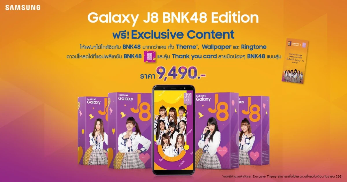 พิเศษสุด Samsung Galaxy J8 x BNK48 แพ็กเกจดีไซน์สุดเก๋ และสุ่มคอนเทนต์สุดเอ็กซ์คลูซีฟส่งตรงจาก BNK48 ทั้ง วอลเปเปอร์ (1 ภาพ) และริงโทน (1 เสียง) พร้อมลุ้นรับการ์ดแทนคำขอบคุณจากเหล่าน้องๆ BNK48 (ขอบอกเลยว่าน่ารักมากๆ) ราคาเครื่องละ 9,490 บาท มีให้เลือกถึง 3 สีได้แก่ สีม่วง, สีดำ และสีทอง จำหน่ายที่ ซัมซุง ออนไลน์ ช้อป รวมถึง ผู้ให้บริการเครือข่าย และร้านค้าชั้นนำ ทั่วประเทศ พร้อมกัน ตั้งแต่วันนี้เป็นต้นไป