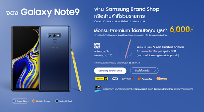 สั่งจอง Samsung Galaxy Note9 กับ Samsung Brand Shop และร้านค้าที่ร่วมรายการ ตั้งแต่วันนี้ - 21 ส.ค. 61 เลือกรับของกำนัล Premium  ได้ตามใจคุณ มูลค่า 6,000 บาท พร้อมรับฟรี ปากกา S Pen Limited Edition สี Lavender Purple มูลค่า 850 บาท (เฉพาะจองที่ Samsung Brand Shop เท่านั้น) นอกจากนี้ยังได้สิทธิรับประกันหน้าจอแตกนาน 1 ปี นอกจากนี้ ยังสามารถนำเครื่องเก่ามาเป็นส่วนลดการเเลกซื้อได้อีกด้วย (เฉพาะ Samsung Brand Shop และร้านค้าที่ร่วมรายการ)
