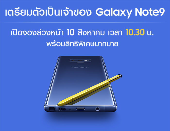 • สั่งจอง Samsung Galaxy Note9 กับ เอไอเอส ตั้งแต่วันนี้ - 19 ส.ค. 31 รับส่วนลดค่าเครื่องสูงสุด 13,000 บาท พิเศษ! รับเพิ่ม S Pen Limoted Edition สี Lavender Purple (เฉพาะช่องทาง AIS Online Store 150 คนแรก) พร้อมด้วยสิทธิพิเศษจาก AIS Hot Deal มูลค่า 10,481.- และการรับประกันจอแตก นาน 1 ปี ดูรายละเอียดเพิ่มเติมได้ที่ www.ais.co.th/samsungnote9