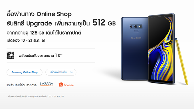 • สั่งจอง Samsung Galaxy Note9 กับ Shopee ตั้งแต่วันนี้ - 21 ส.ค. 31 พิเศษ อัพเกรดความจุเครื่อง จาก 128GB เป็น 512GB (RAM 8GB) ทันที ในราคาเพียง 33,900 บาท พร้อมผ่อน 0% นานสูงสุด 10 เดือน กับธนาคารชั้นนำที่ร่วมรายการ และรับประกันจอแตก นาน 1 ปี เมื่อลงทะเบียนรับสิทธิ์ที่ GALAXY GIFT ภายในวันที่ 22-31 ส.ค. 61 (จำกัดสิทธิในการสั่งซื้อท่านละ 1 เครื่องเท่านั้น)