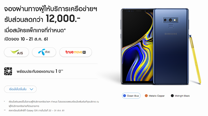 สั่งจอง Samsung Galaxy Note9 กับ เอไอเอส, ดีแทค และทรูมูฟ เอช รับส่วนลดมากถึง 12,000 บาท รายละเอียดดังนี้