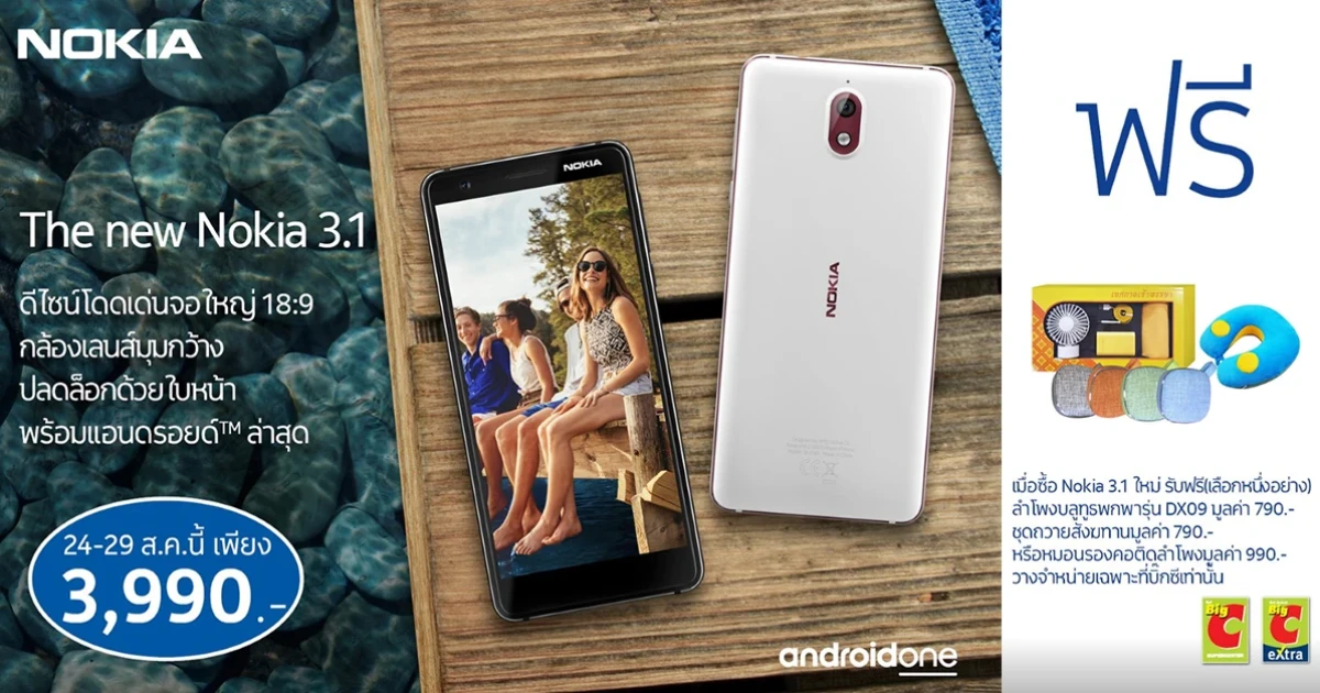 เมื่อซื้อ Nokia 3.1 ในราคาพิเศษเพียง 3,990 บาท จากราคา 4,990 บาท ที่บิ๊กซีซูเปอร์เซ็นเตอร์ทุกสาขาทั่วประเทศ เลือกรับฟรี! ลำโพงบลูทูธพกพา รุ่น DX09 มูลค่า 790 บาท หรือ ชุดถวายสังฆทาน มูลค่า 790 บาท หรือ หมอนรองคอพร้อมลำโพง มูลค่า 990 บาท ตั้งแต่วันนี้ถึงวันที่ 29 สิงหาคมนี้เท่านั้น ติดตามข่าวสารข้อมูลและกิจกรรมของโนเกียเพิ่มเติมได้ที่ www.facebook.com/NokiamobileTH/
