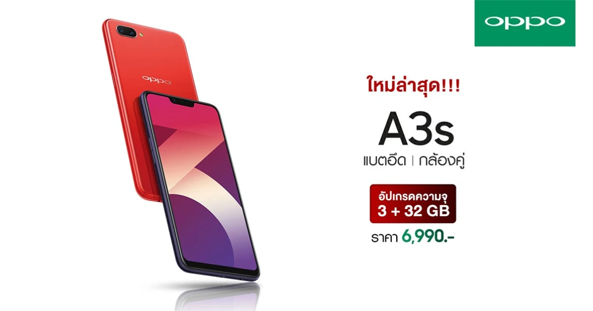 หลังจากที่รอคอยกันมานาน OPPO A3s รุ่น RAM 3GB, ROM 32GB ก็วางจำหน่ายในประเทศไทยแล้วครับ ในราคา 6,990 บาท มีด้วยกันสองสีเช่นเดิม คือ สีม่วงเข้ม และสีแดง พร้อมสโลแกน "กล้องคู่ แบตอึด" และเป็นผู้เชี่ยวชาญด้านการเซลฟี่