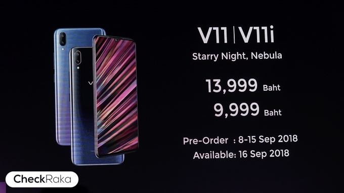 Vivo V11 และ Vivo V11i มีให้เลือก 2 สี ได้แก่ Starry Night สีดำไล่เฉดน้ำเงิน และ Nebula สีฟ้าไล่เฉดม่วง สวยงามมากๆทั้ง 2 สีและสื่อถึงกาแล็กซี่อันไกลโพ้น ราคา 13,999 บาท และ 9,999 บาท เปิดจองล่วงหน้าตั้งแต่วันที่ 8 - 15 ก.ย. 61 และวางจำหน่ายอย่างเป็นทางการทั่วประเทศวันที่ 16 ก.ย. 61