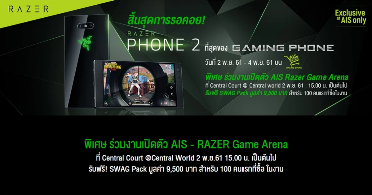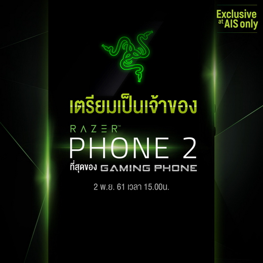 AIS เตรียมวางจำหน่าย RAZER PHONE 2 ที่สุดของสมาร์ทโฟนสำหรับคนชอบเล่นเกม แบบเอ็กซ์คลูซีฟเฉพาะที่ เอไอเอส รายแรก และรายเดียวในไทย พร้อมข้อเสนอสุดพิเศษก่อนใคร ผ่านทาง AIS Online Store 3 วัน ตั้งแต่วันที่ 2 พ.ย. 61 เวลา 15.00 น. - 4 พ.ย. 61 เวลา 23.59 น.