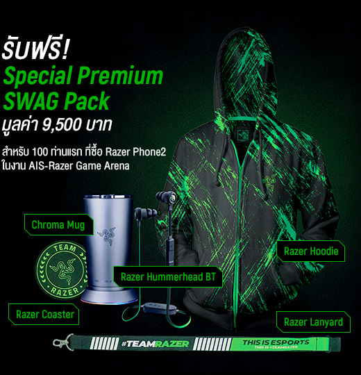 พร้อมเชิญชวนสาวกอีสปอร์ต ร่วมงานเปิดตัว RAZER PHONE 2 อย่างเป็นทางการ วันที่ 2 พ.ย. 61 เวลา 15.00 เป็นต้นไป ที่ลาน Central Court ชั้น 1 ศูนย์การค้าเซ็นทรัลเวิล์ด พิเศษ! เปิดจำหน่ายเครื่อง Razer Phone 2 ภายในงาน 100 เครื่องแรก พร้อมรับฟรี SWAG Pack มูลค่า 9,500 บาท