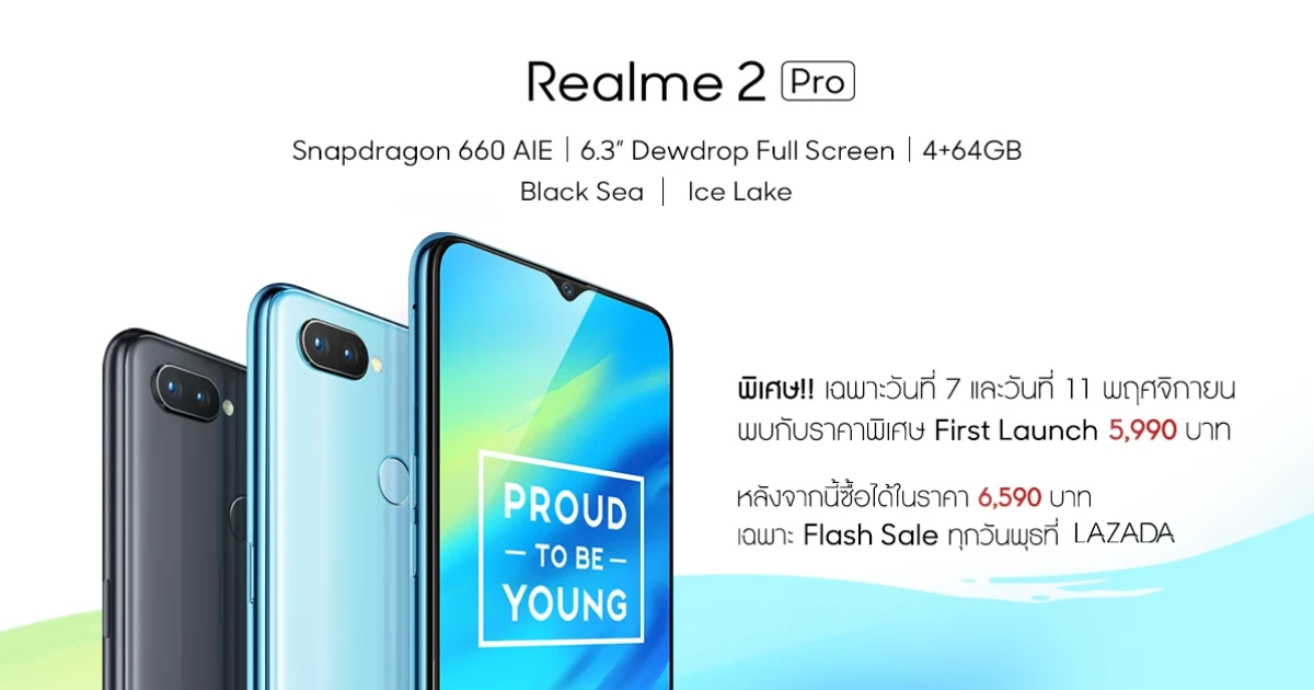 Realme 2 Pro เปิดตัวในประเทศไทยพร้อมราคาสุดคุ้ม เพียงแค่ 6,590 บาทเท่านั้น เรียกได้ว่าไม่มีสมาร์ทโฟนรุ่นไหนในตลาดตอนนี้ที่จะทำราคาได้ดีขนาดนี้แล้วครับ แต่แค่นั้นยังไม่พอ Realme จับมือกับ Lazada จัดกิจกรรม Flash sale ในวันที่ 7 พฤศจิกายนนี้ พร้อมวางจำหน่ายอย่างเป็นทางการบน Lazada ในวันที่ 11 พฤศจิกายน โดยทั้ง 2 วันนี้จะลดราคาทันทีเหลือเพียงแค่ 5,990 บาทเท่านั้นเองครับ ผมแนะนำเลยว่าไม่ควรพลาดจริงๆ ครับ